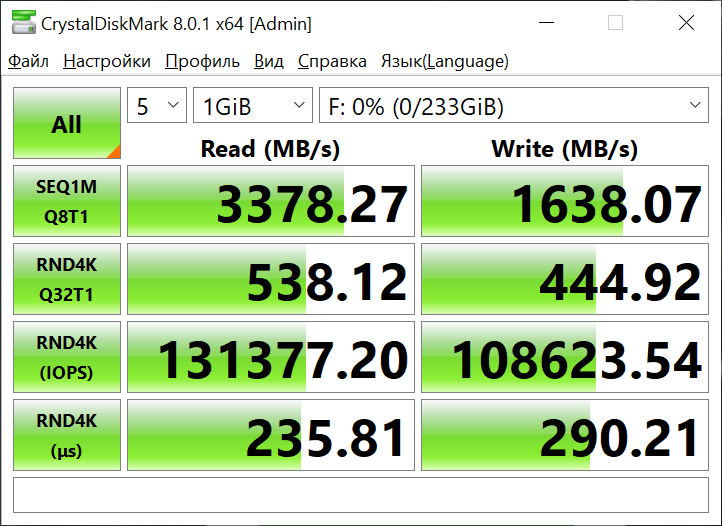 Прежде, чем приступить к тестированию необходимо пройти процедуру инициализации и произвести разметку накопителя, назначив соответствующие буквы для тома. По окончанию данной процедуры операционная система Windows 10 Pro распознала устройство, указав, что пользователю доступно доступно 232 Гб.