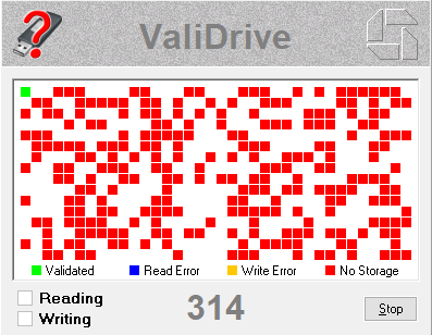 Ну и H2testW хорош своей дотошностью, поскольку позволяет и брак ловить, но при настройках по-умолчанию работает намного медленнее, чем ValiDrive из-за разных алгоритмов — он тупо прописывает весь _заявленный_ в паспорте объём, а не выборочно