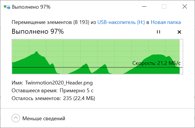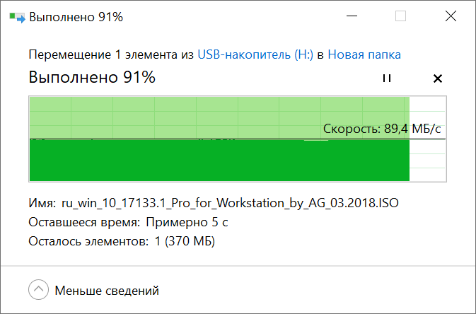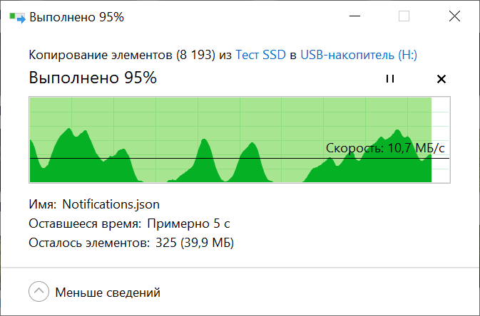 Безусловно необходимо провести тестирование скорости записи/чтения в реальных условиях. Для этого с файлом, объем которого составляет 4.5 Гб были произведены следующие операции: