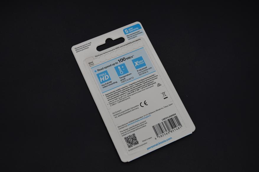 Упакована карта памяти в классический картонный конверт, с отверстием в середине, внутри которого находится пластиковый блистер с картой памяти. На упаковке содержится достаточно подробная информация об устройстве. На лицевой поверхности указано, что это накопитель Kioxia Exceria SDXC UHS-I 256GB.