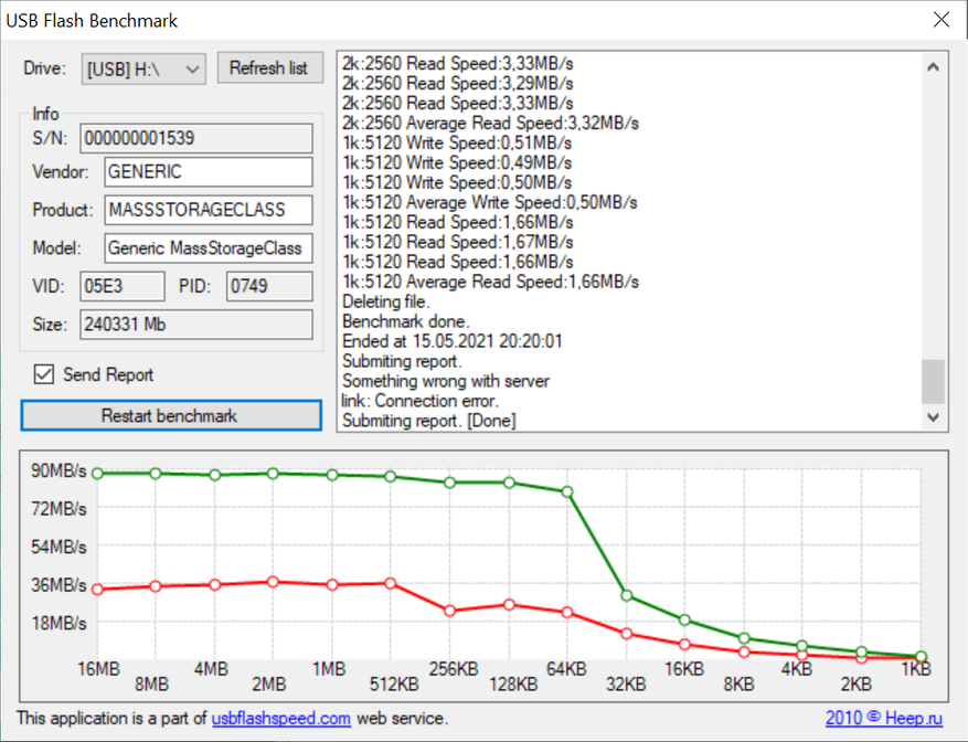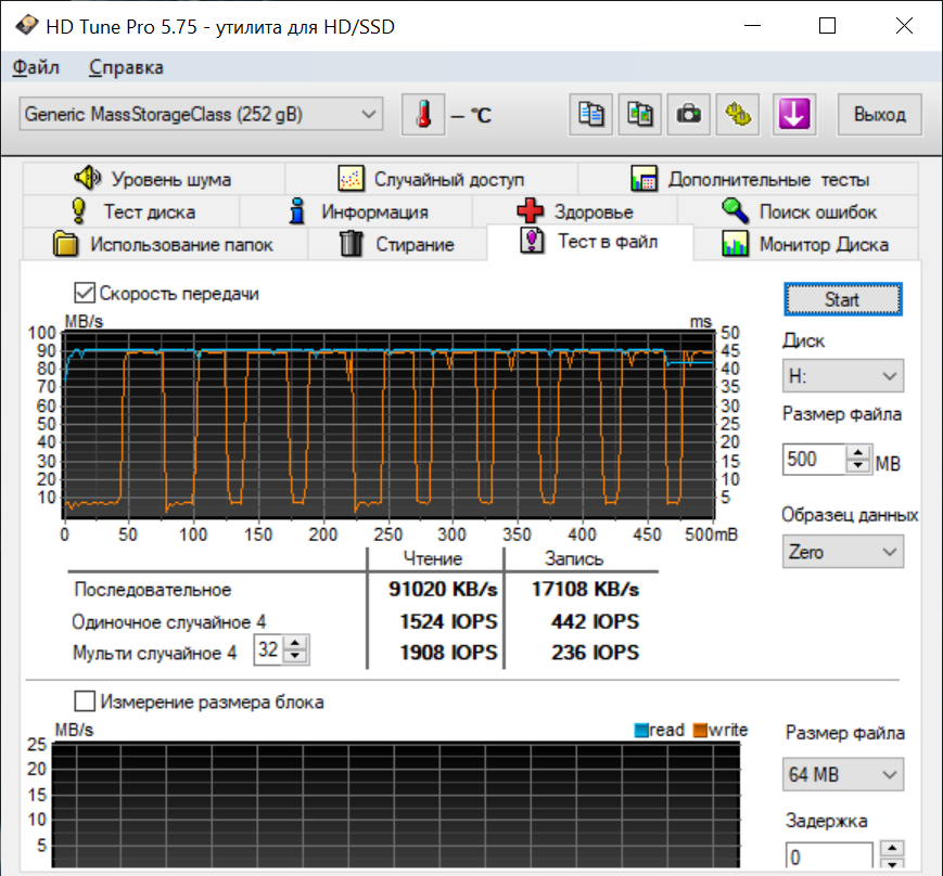 Далее скоростные характеристики карты памяти были оценены в условиях, приближенных к реальным. Для этих целей были осуществлены пробные циклы чтения/записи на/с карты памяти:
