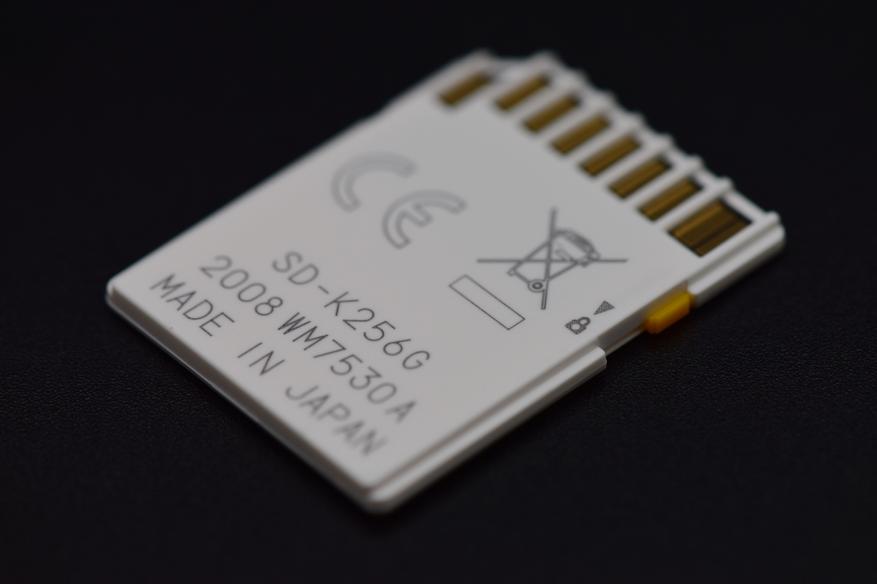 На тыльной поверхности расположена контактная группа, гордая надпись, говорящая о том, что карта памяти изготовлена в Японии, здесь же находится серийный номер устройства.