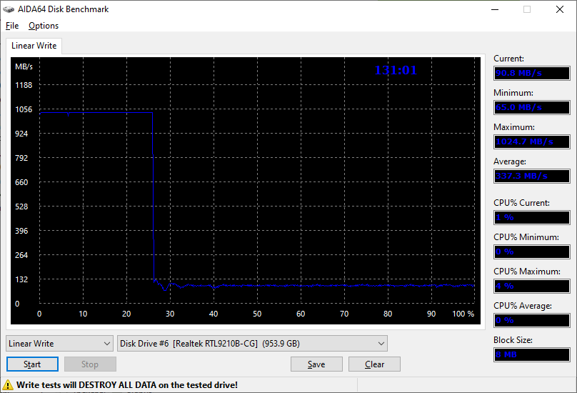 Если запустить AIDA64 v4, то средняя скорость чтения достигает 1011,5 MB/s, выдавая паспортные значения. Скорость записи аналогична Orico GV100 — под SLC-кэш отводится около 26% от всего объема или 248 GB. Далее скорость падает до отметки 90,8 MB/s и держится на ней до самого конца. В принципе, картина присуща Realtek RTL9210B в полном объеме.
