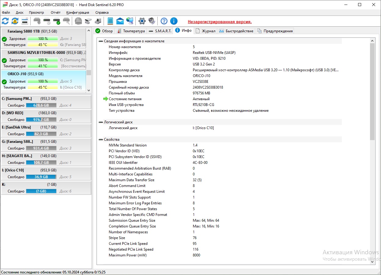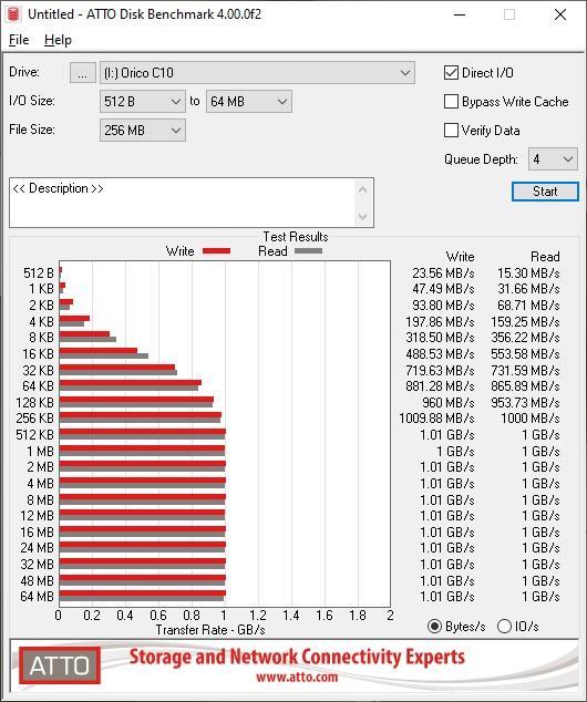 Переходим к тестам. Подключение накопителя будет осуществляться в разъем USB 3.2 Gen 2x2 с возможной скоростью 20 Гбит/с, так что узким местом он не будет. Итак, на мое удивление, CRI увидел в Orico C10 модель Orico J10 с объемом 1024,2 GB. Самое странное со всем этом то, что в ассортименте Orico уже есть модель J-10, представляющая собой SSD NVMe-накопитель с интерфейсом PCIe 4.0 x4 и скоростями до 3500/2800 MB/s. (Realtek RTS5765DL).