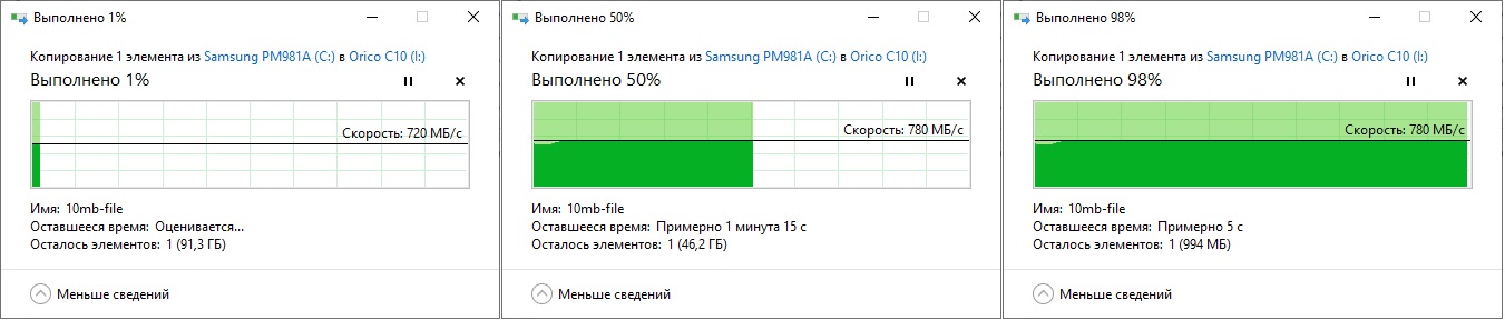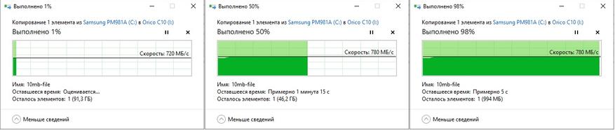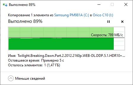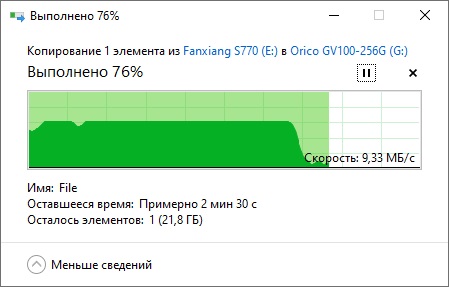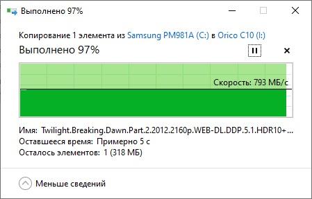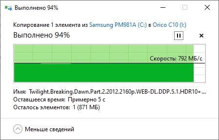 В завершении проверим скоростные характеристики в реальной эксплуатации. Для этого попробуем скопировать 100-гигабайтный файл с NVME-накопителя Samsung PM981а на тестируемый Orico J10. Скорость записи на протяжении всего времени составляла ~780 МБ/с, а общее время составило 2 минуты 35 секунд.