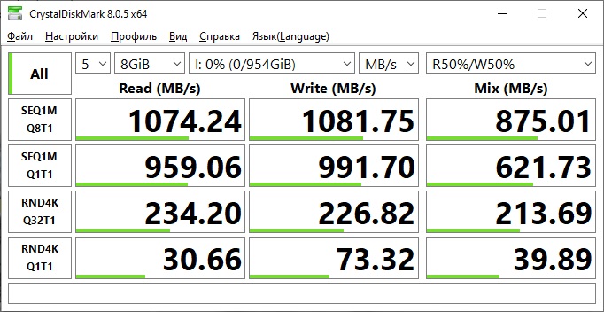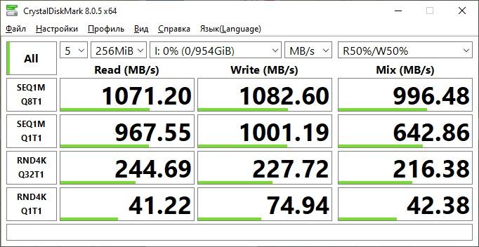 CristalDiskMark демонстрирует «заявленные» 1000 MB/s и даже немного превышает его. Данный тест был прогнан в 5 проходах на 256, 1024 и 8192MB файлах.