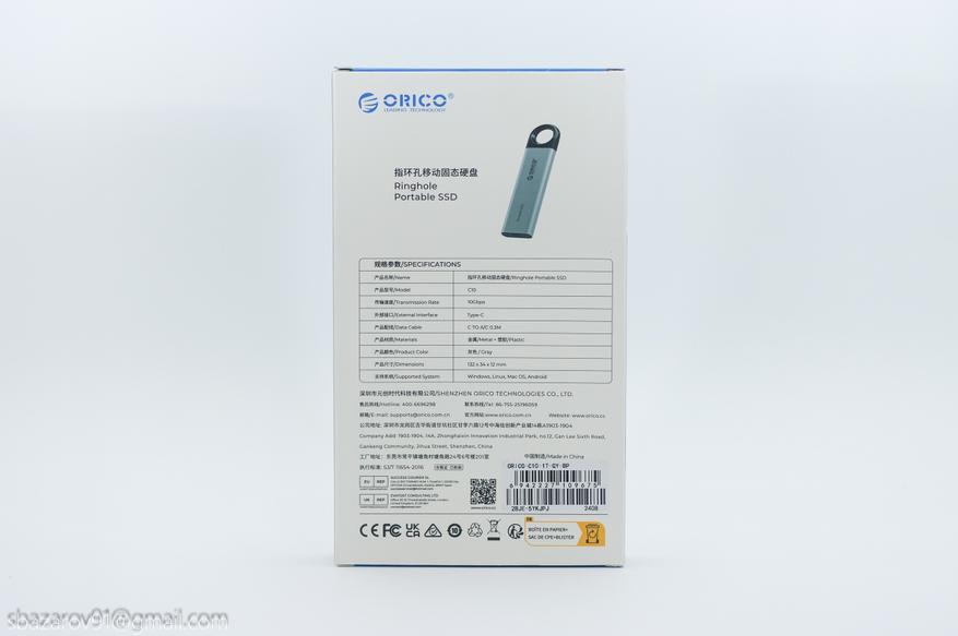 Портативный SSD-накопитель Orico C10 поставляется в обновленной упаковке сине-серого цвета. На лицевой стороне внешний вид устройства, тогда как на обороте его технические характеристики.