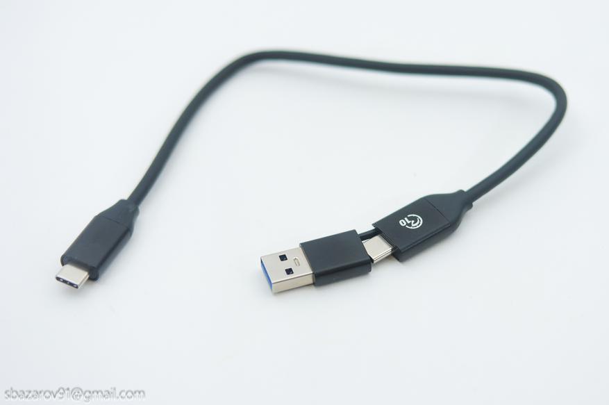 Интерфейс для подключения — Type-C (USB3.1 Gen2) со скоростью 1000 МБ/с (10GBps). В комплекте предусмотрен короткий кабель со встроенным переходником с Type-C на USB-A. Его длина — 30 сантиметров.