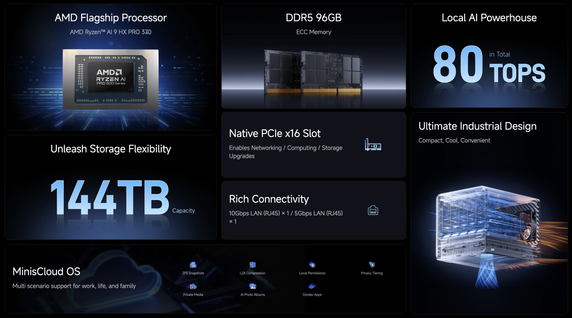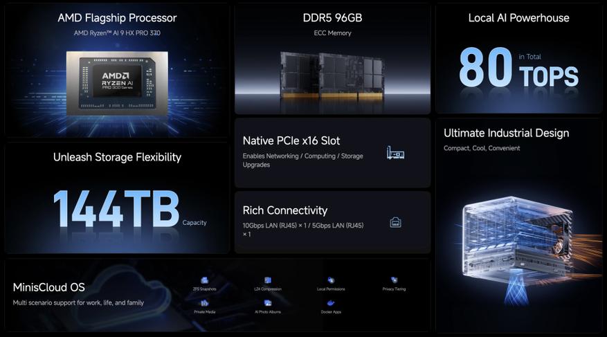 Minisforum подтвердила, что модели N5 и N5 Pro будут оснащаться процессорами AMD Ryzen AI 9 HX 370 и до 128 ГБ оперативной памяти DDR5 EEC SO-DIMM. Представитель компании также сообщил о возможности установки дискретного графического процессора через слоты PCIe x16 (PCIe 4.0 x4) или OCuLink