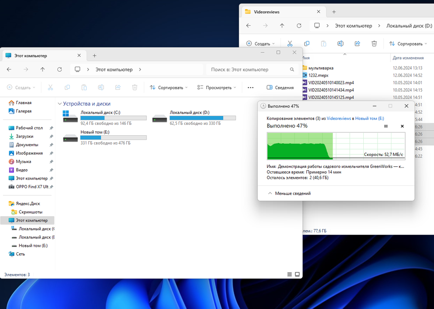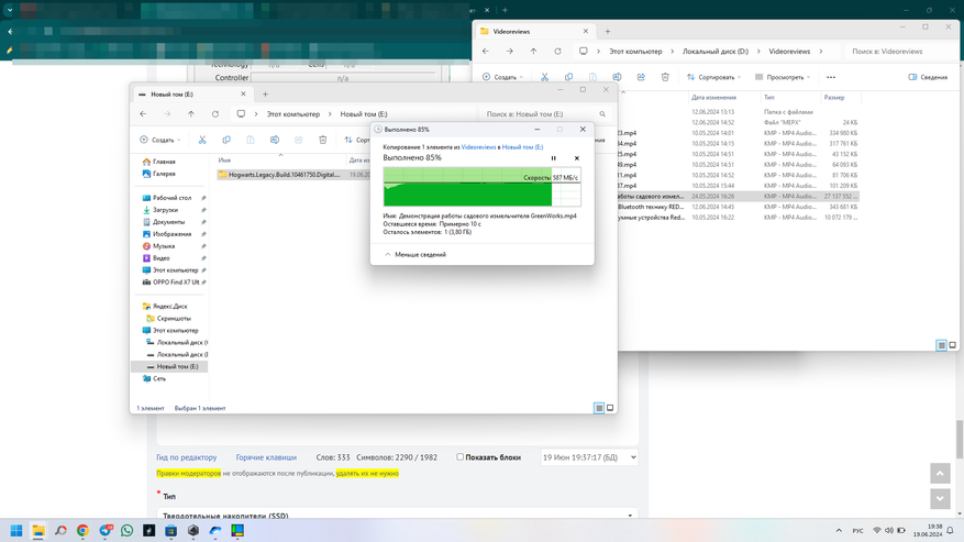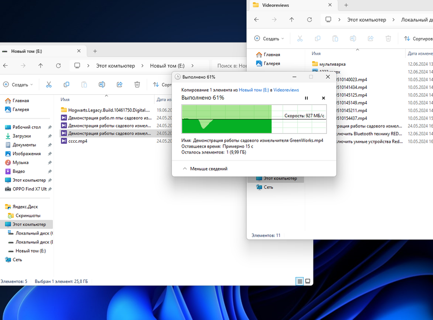Запишем на диск видеофайлы. скорость около 600МБ/с на запись. На чтение 900 МБ/с