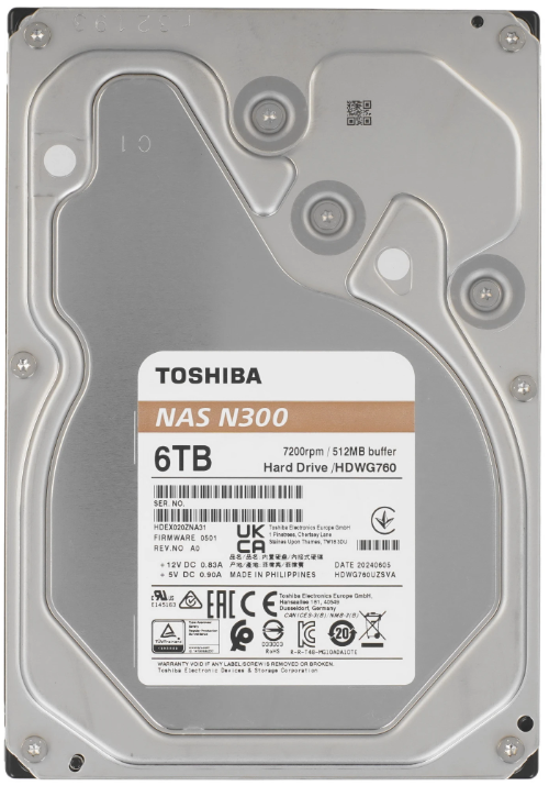 Жесткие диски серии Toshiba N300 разработаны для NAS-систем и идеально подходит для дома, небольшого офиса и малого бизнеса. Он поддерживает до восьми отсеков, имеет ёмкость до 20 ТБ и скорость вращения 7200 об/мин, обеспечивая стабильную работу 24/7. Диск отличается высокой надёжностью с нагрузкой до 180 ТБ в год и средней наработкой на отказ 1,2 миллиона часов. Он демонстрирует хорошие показатели в RAID, обеспечивает стабильные последовательные скорости и является выгодной альтернативой Seagate IronWolf для ёмкостей до 12 ТБ, хотя при интенсивной работе может нагреваться.