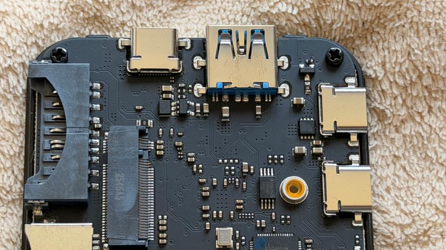 На торцах разместили все основные интерфейсы хаба. На одном найдем индикатор статуса работы, Type-C разъем для подключения к смартфону (ПК, ноутбуку или планшету), Type-C разъем с возможностью зарядки PD 100W. На следующем торце разъем 3.5мм, винтик крепления корпуса и HDMI разъем. На третьем торце расположили картридер для MicroSD и SD карт. На четвертом разъем USB и Type-C (у обоих скорость передачи 10 Гбит/с).
