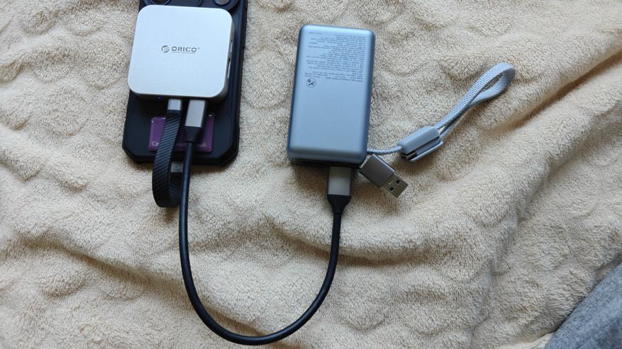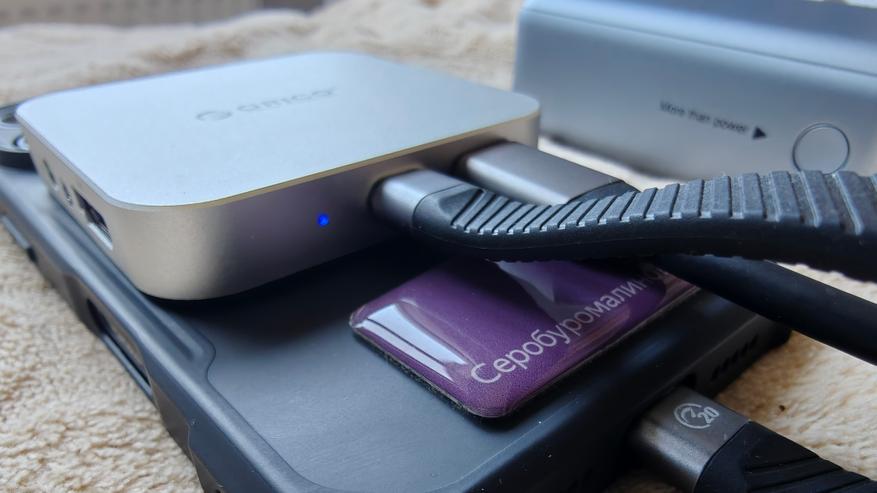 Для использования просто вставить кабель Type-C (напомню, он есть в комплекте) в разъем PC на хабе и в смартфон.