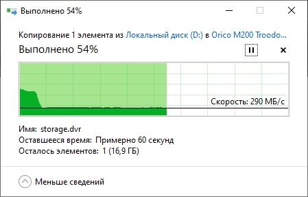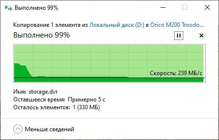 Копирование файла объемом 40Гб. Средняя скорость на протяжении всего копирования составляет 290МБ/с, после 60% записи файла происходит просадка до 239МБ/с и держится до конца теста.