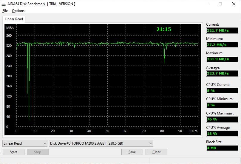 AIDA64 Disk Benchmark. Средняя скорость записи держится на уровне 321.7МБ/с. В начале и ближе к концу теста можно наблюдать незначительные просадки по скорости чтения.