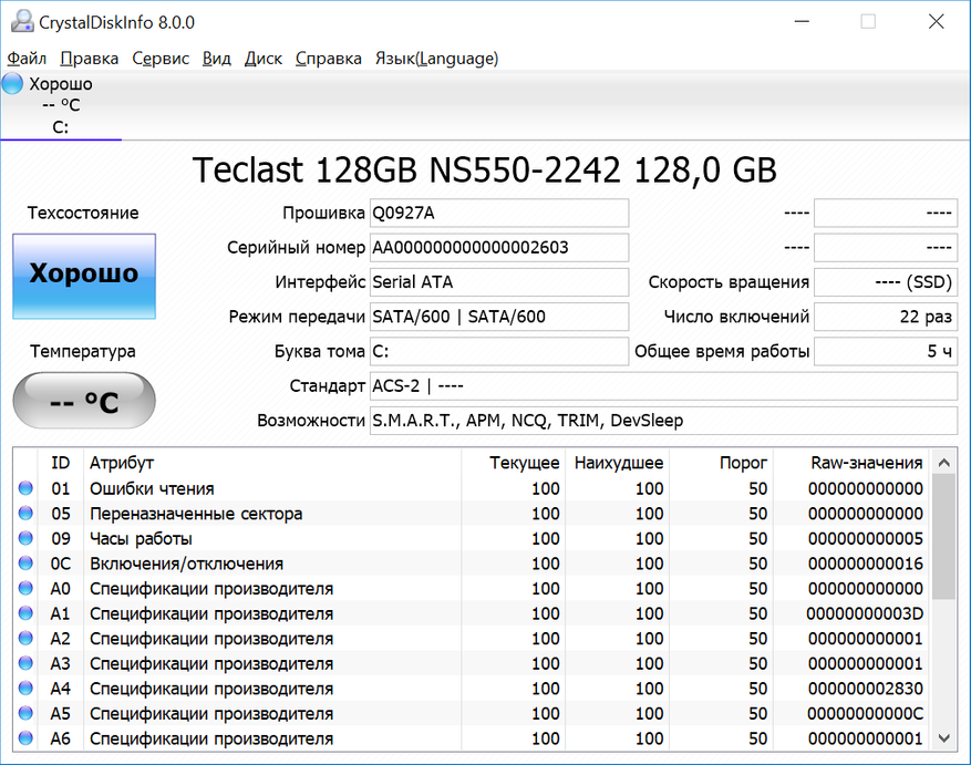 Отчёт Crystal Disk Info. Датчик температуры отсутствует, хотя стабильные 40 градусов красуются при любых манипуляциях с диском.