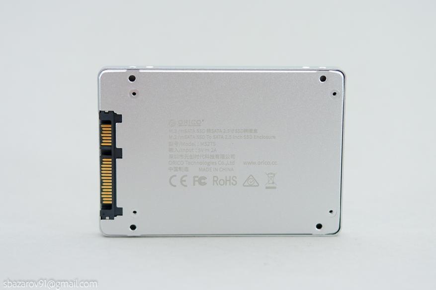 Кейс выполнен в формате 2.5'' и имеет полностью алюминиевый корпус. Подключение стандартное — SATA 3.0. На обороте имеются характеристики кейса и необходимое питание для запуска — 5V2A.