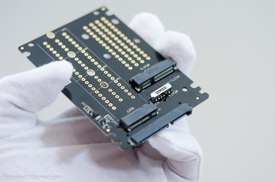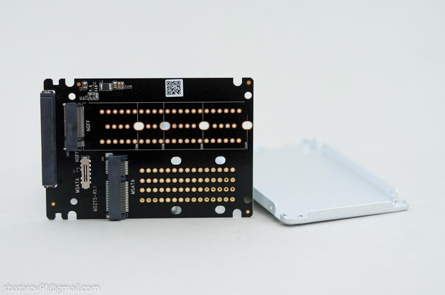 Внутри кейса находится простая плата, без какого либо контроллера. Ревизия платы — MS2TS-R1.1. Под накопители предусмотрены специальные площадки, позволяющие установить следующие варианты: 2230, 2242, 2260, 2280 — M.2 SSD и 30*30*4, 50*30*4 — mSATA SSD.