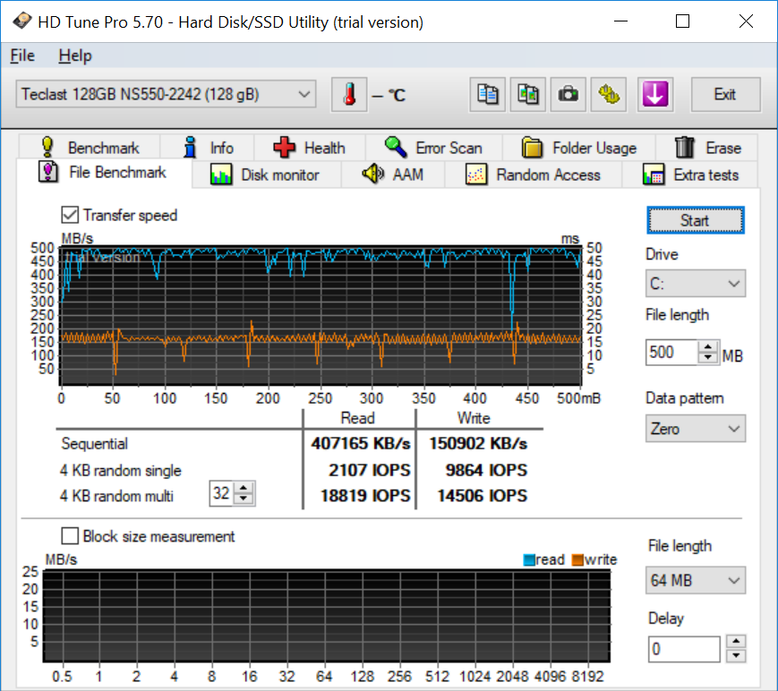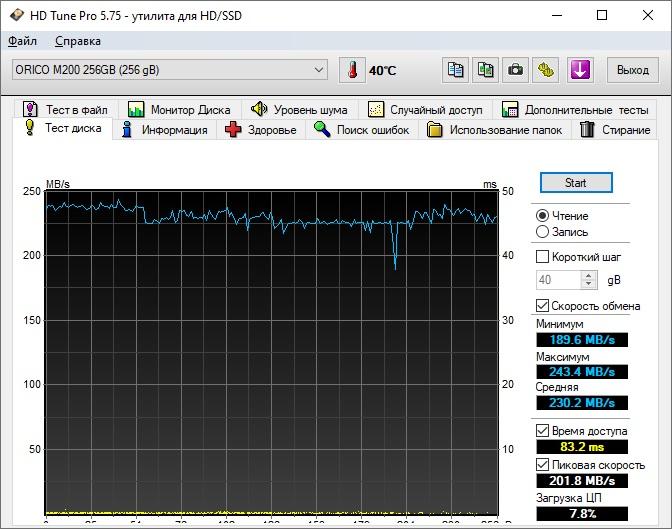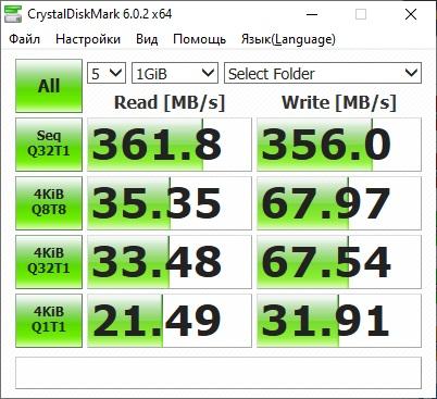 SSD-Z и его встроенный тест на скорость чтения. И тут стали появляться сомнения в заявленных 556/510МБ/с (скорости чтения/записи). Хотя если обратить внимание на рекламную картинку, то можно увидеть приписку «The data is from ORICO lab, taking 512G as an example», видать в данном объеме используются иные компоненты. Ну и если обратить внимание на отзывы реальных покупателей, то скорость варьируется в широком диапазоне от 350 до 550МБ/с. Китайский рандом в деле.