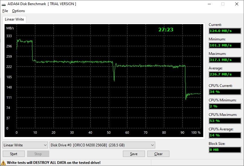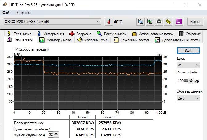 При записи объемного (100ГБ) файла можно наблюдать снижение скорости уже после 20ГБ. После чего происходит стабильная работа на скорости около 240МБ/с.