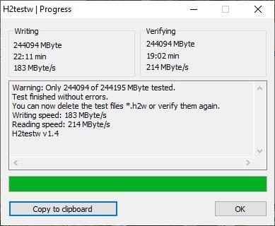 Ну и финалом запустим H2testw. Результат честный, объем соответствует заявленному.