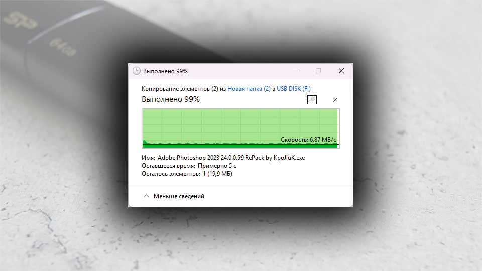 Желая проверить лабораторные цифры в обычных бытовых условиях, я решил перекинуть на накопитель крупный установочный файл (5,08 ГБ) через стандартный интерфейс Windows. Чуда не произошло: в стартовые секунды процесс идет бодро (40-45 МБ/с), но вскоре происходит просадка до 6,8-11,4 МБ/с, и именно в этом темпе копирование завершается. В итоге на перенос архива весом 5,08 ГБ ушло ровно 9 минут и 58 секунд.