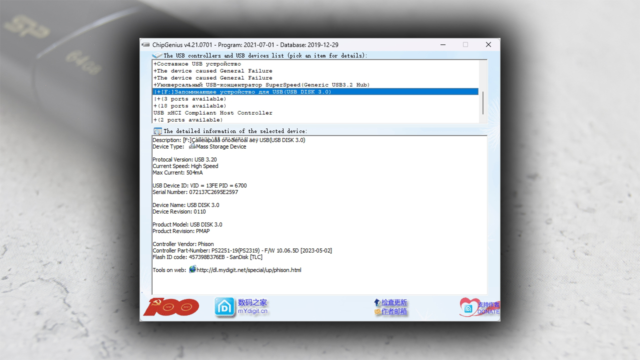 Чтобы выяснить аппаратное содержимое гаджета, запустим известную программу ChipGenius. В роли микроконтроллера выступает чип Phison PS2251-19 (PS2319) — весьма распространенный выбор для недорогих решений стандарта USB 3.0. Флеш-память здесь установлена от SanDisk (тип ячеек — TLC).