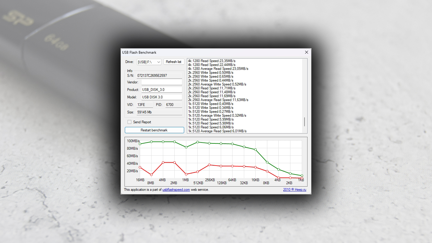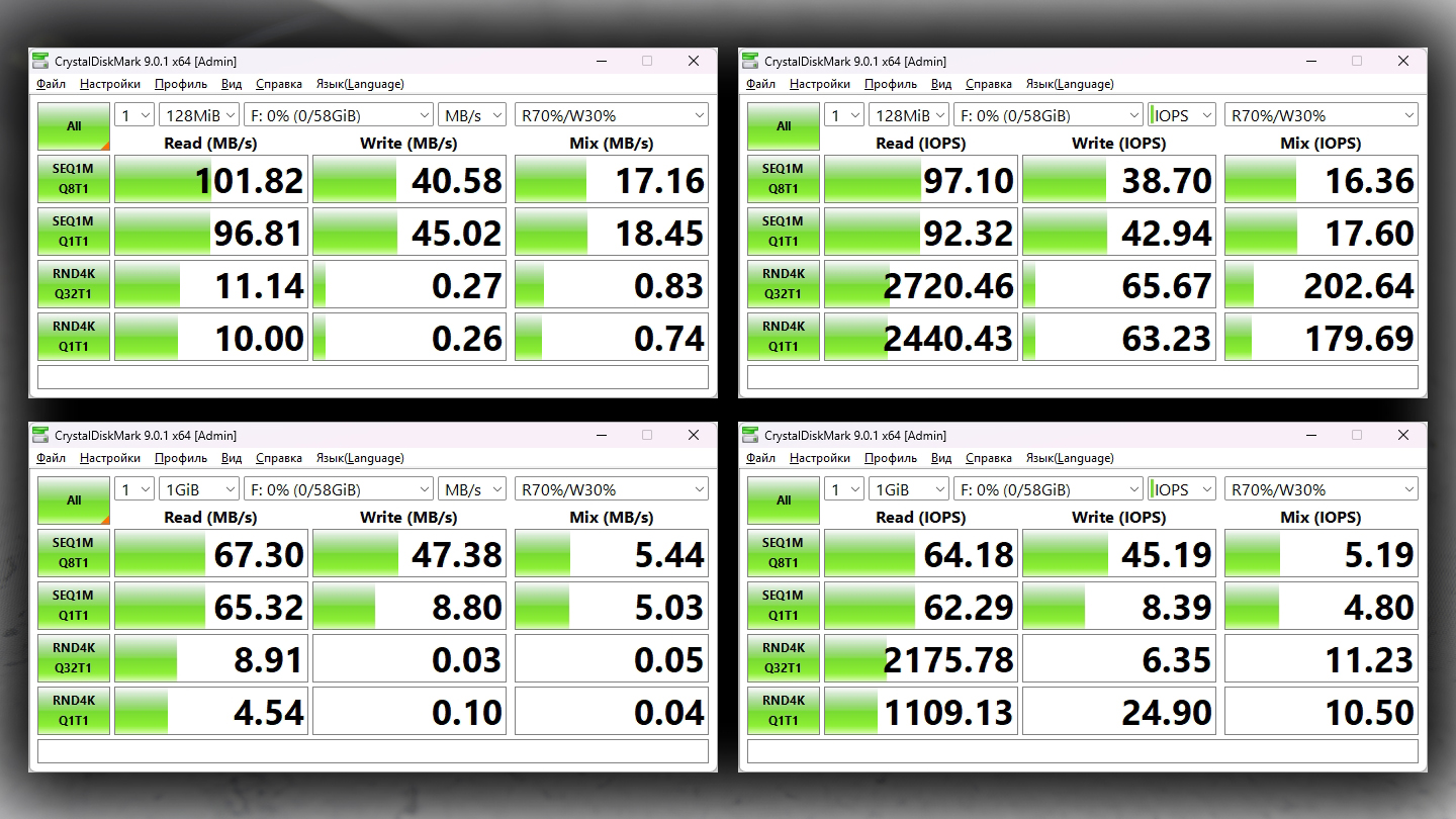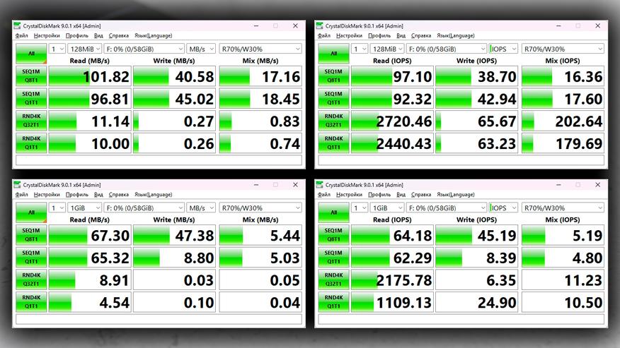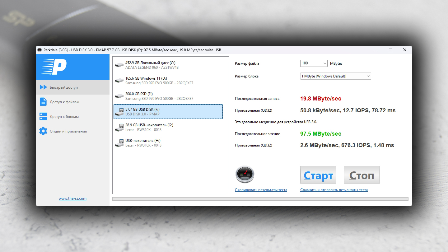 В синтетических программах скорость последовательного чтения достигает 100 мегабайт в секунду, тогда как линейная запись держится в пределах 40-45 МБ/с. Обработка микроскопических блоков (4K), как и положено бюджетным носителям, находится на удручающе низком уровне.
