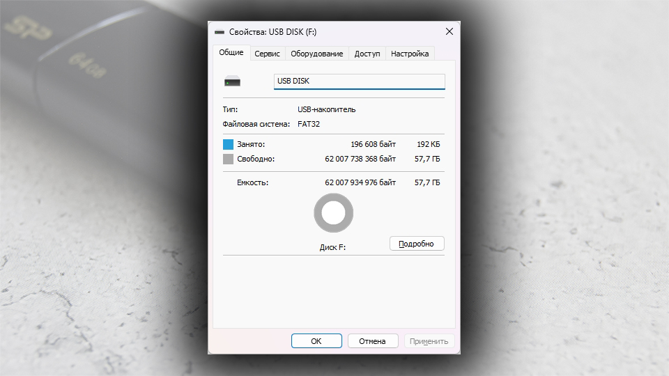 Вставив флешку в компьютер на базе Windows в первый раз, обнаруживаем заводское форматирование в архаичной системе FAT32. Подобный шаг гарантирует идеальную связку с различной техникой (старыми автомагнитолами или ТВ-приставками), однако блокирует перенос одиночных файлов тяжелее 4 ГБ. Из коробки владельцу предоставляется 57,7 гигабайт полезной емкости.