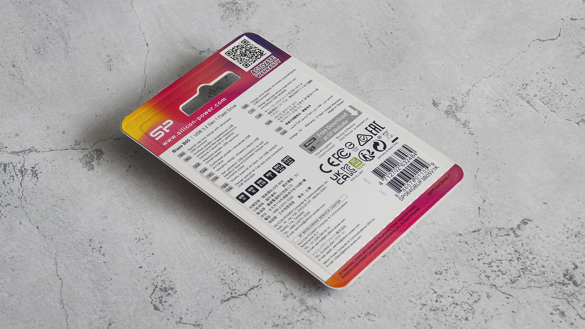 Фронтальная часть коробки содержит крупные надписи с названием модели (Blaze B05), вместимостью (64 ГБ) и версией интерфейса (USB 3.2 Gen 1). Сквозь прозрачное окно покупатель может легко рассмотреть внешний вид и размеры гаджета прямо в магазине. Чуть сбоку напечатан значок «Slide to use», который прямо указывает на механизм скрытого штекера.