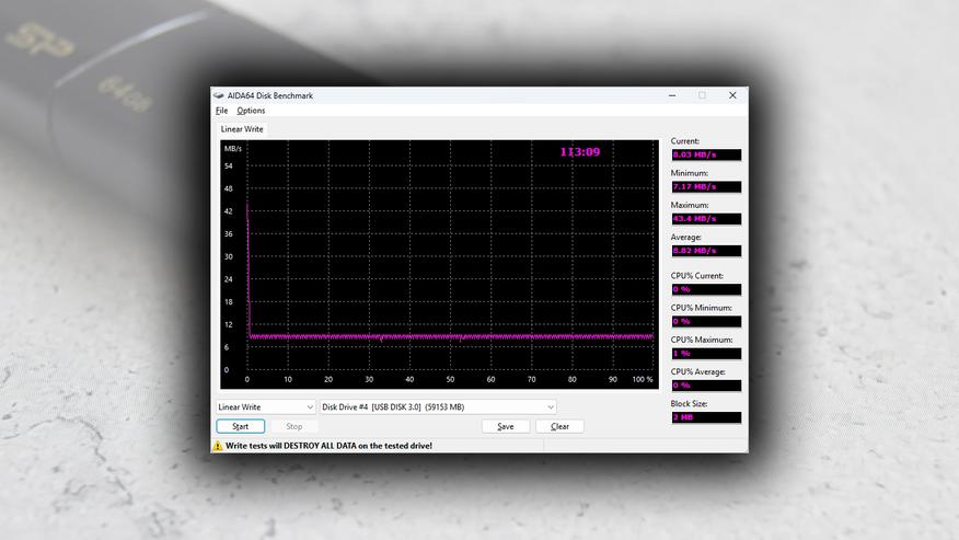 Кривая записи резво началась с показателя около 43 МБ/с, но мгновенно рухнула до скромных 8-9 МБ/с, оставаясь на этом плато до самого финиша. Именно таковы реальные скоростные возможности чипа. Чтобы полностью забить память устройства от начала до конца, потребовался 1 час и 53 минуты.