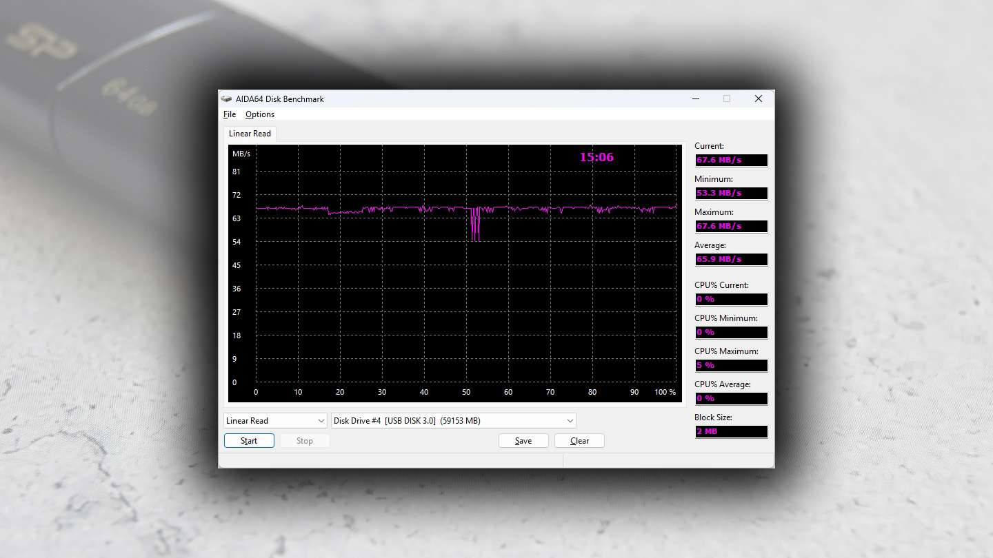 А вот с чтением дела обстоят куда позитивнее. Линия на графике вырисовалась практически ровной. Усредненный показатель пропускной способности достиг отметки 65,9 МБ/с.