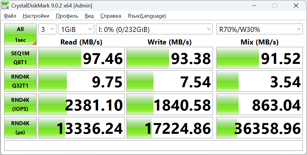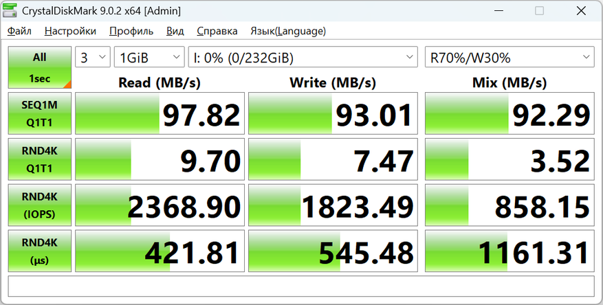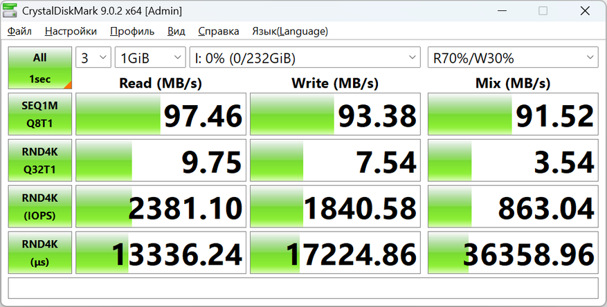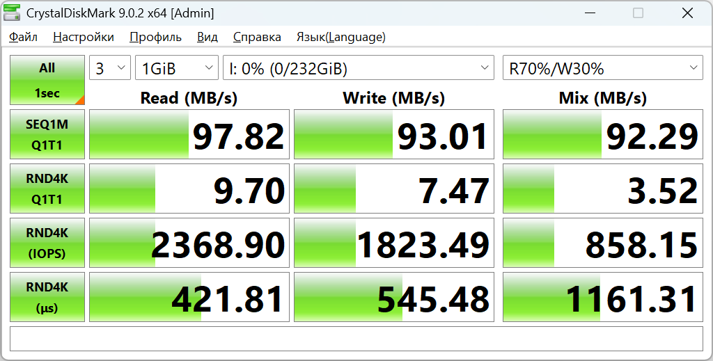 Во втором профиле цифры практически не меняются. Последовательные скорости остаются на уровне 97/93 МБ/с, а случайные операции повторяют те же значения. Это хороший момент — карта не проседает при смене профиля нагрузки, поведение ровное.