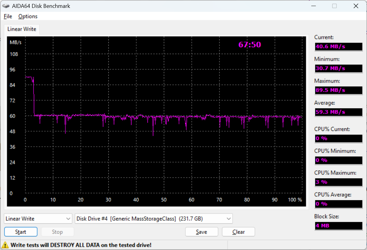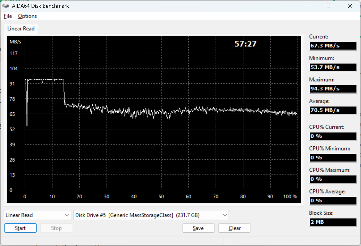 Самое интересное — линейные тесты в AIDA64. Чтение сначала держится около 90+ МБ/с, затем примерно после первых 10-15% объема происходит снижение до 65-70 МБ/с, и дальше карта работает уже в этом диапазоне. Средняя скорость чтения получилась около 70 МБ/с.