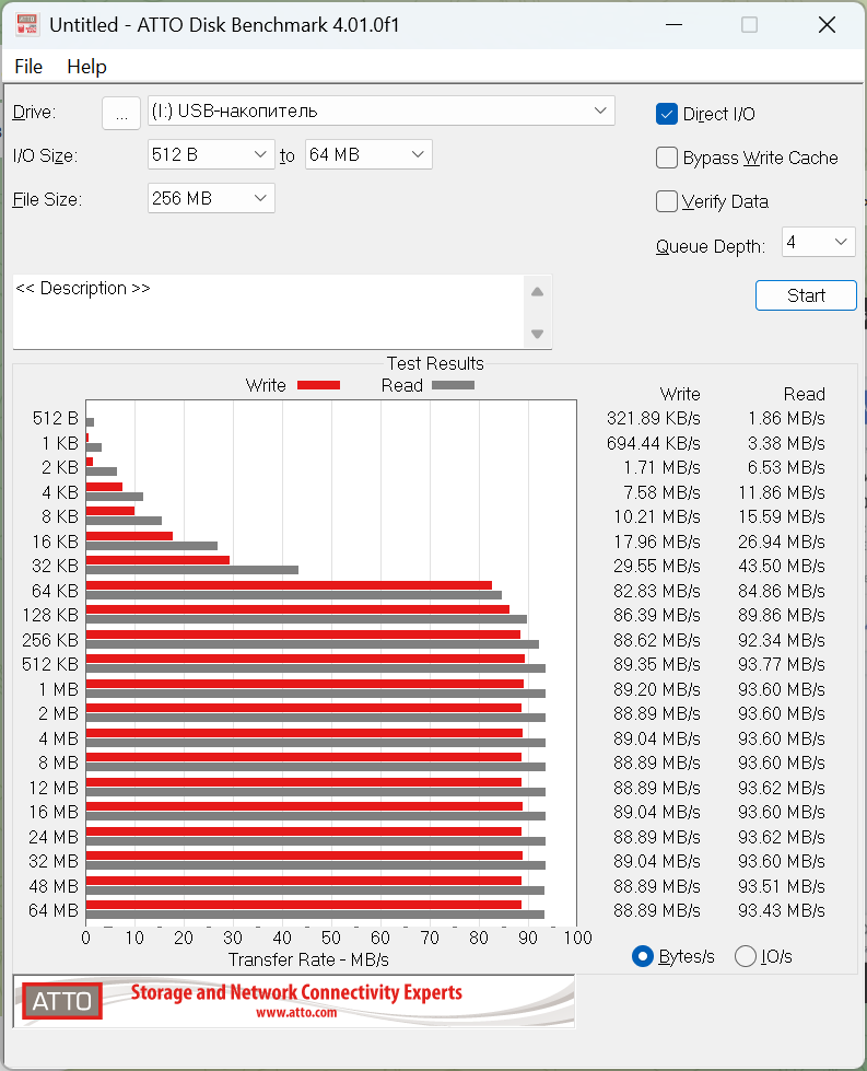 - после блоков 64-128 КБ она уже держит около 85-90 МБ/с на записи