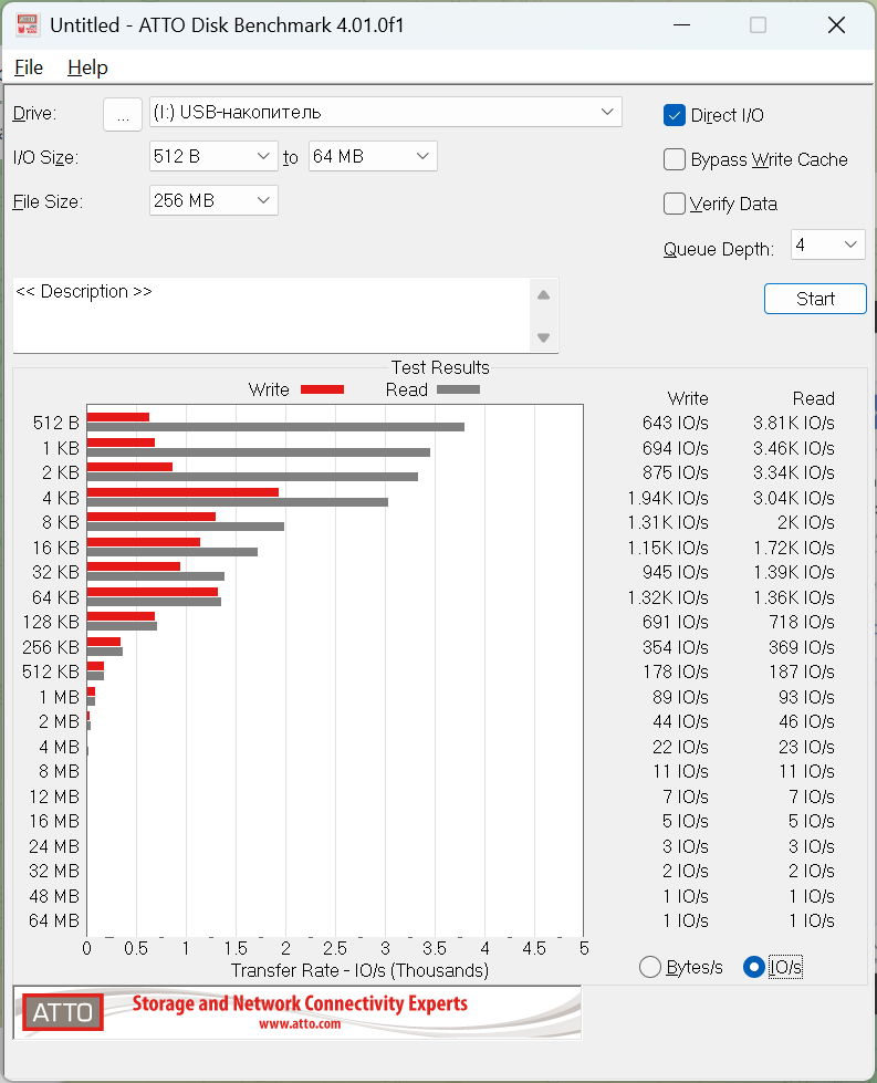Дальше посмотрел ATTO. Здесь видно, как карта выходит на рабочие скорости: