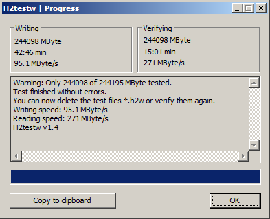 Программе H2testw понадобилось чуть менее часа, чтобы заполнить весь диск. Средняя скорость записи составила 95 МБ/с, средняя скорость чтения 271 МБ/с. Эта программа не просто заполняет диск данными, но и проверяет, считывая всё, что было записано, и сверяя контрольные суммы. С помощью неё легко распознать диски с фиктивным объёмом. В данном случае всё честно и ошибок не обнаружено.