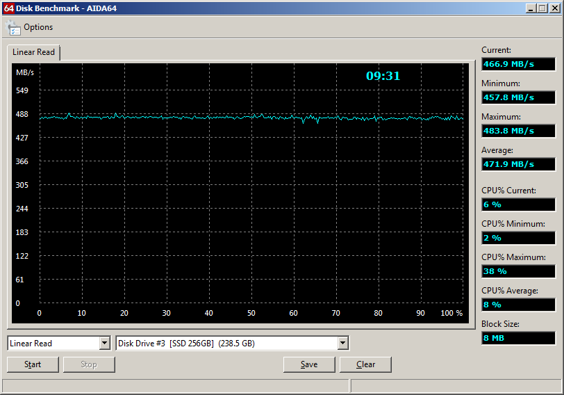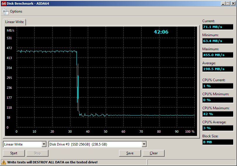 Скорость линейного чтения большими блоками составляет около 460 МБ/c. При последовательной записи первые треть диска записываются с такой же высокой скоростью (режим SLC-кеша), дальше скорость снижается до 70 Мб/c и равномерно держится до конца диска.