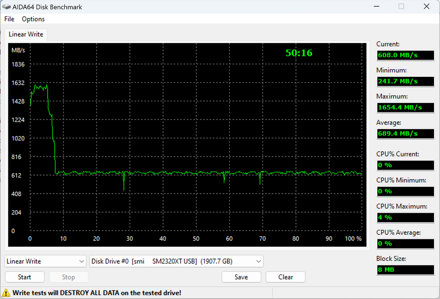 Что ещё хорошо в таких прошивках — вот это второй проход (по мусору) в режиме Gen2x2. Несложно заметить, что он практически не отличается от первого. Статический SLC-кэш сам контроллер почистит без посторонней помощи, да и его производительности достаточно, чтобы писать с одинаковой скоростью хоть в «чистую» память, хоть одновременно с её стиранием. То есть вот эти 600 с лишним мегабайт в секунду — то, на что можно твёрдо рассчитывать в любых условиях. В отличие от многих накопителей, сильно зависящих от работы TRIM и тому подобного — почему не стоит расстраиваться по поводу скромности полученного результата: он не максимальный, а практически гарантированный (если, конечно, не подключить SSD к порту Gen1 или вовсе USB 2.0).