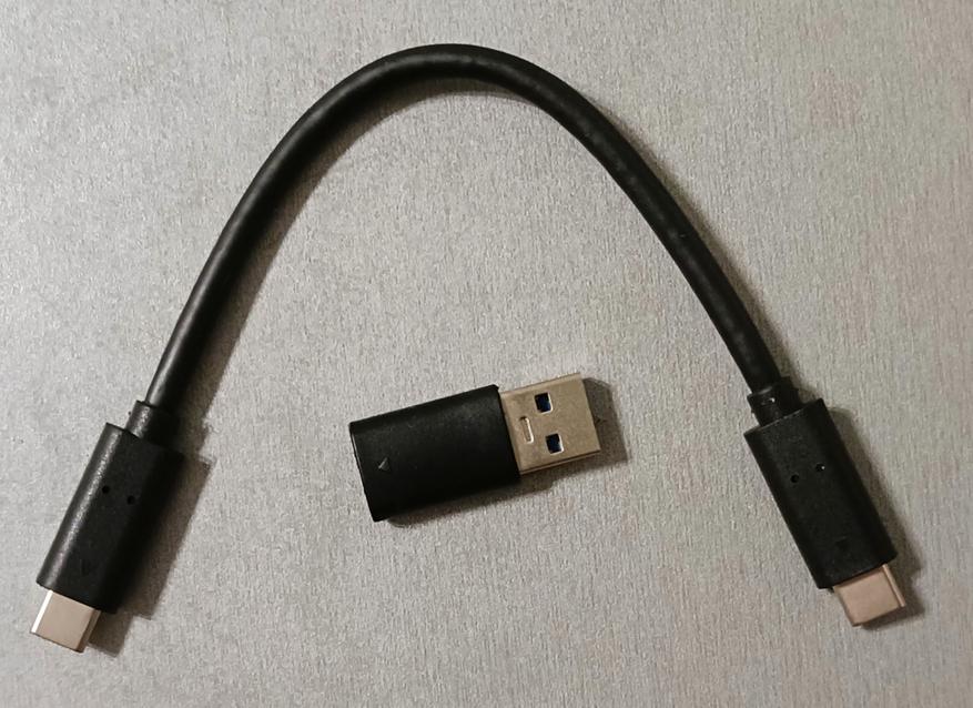 Но не стоит забывать, что они обходятся безо всяких кабелей. Здесь же это невозможно, и коробочка 66x33,4x9,7 мм — не всё, что придётся носить с собой. Комплектный кабель короткий, так что компактный. Естественно, снабжён разъёмами USB-C с обеих сторон — ни в какие другие 20 Гбит/с просто не пролазит: контактов не хватает. Но для совместимости со «старыми» портами в коробке нашлось и место для компактного переходника. Естественно, скорость в этом случае примерно «ополовинится». Что технически неизбежно, но многие до сих пор путаются в скоростных режимах USB.