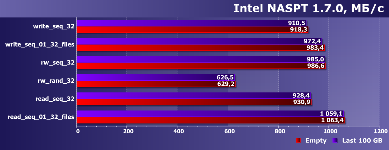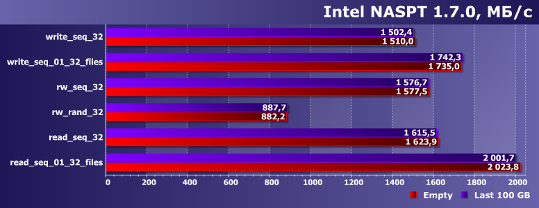 Но надо ещё на самом деле найти компьютер с портами Gen2x2, а с более массовыми, но вдвое более медленными Gen2 всё проще — фактически именно интерфейс и будет сдерживать производительность. В том числе, нередко и при записи — как было показано выше, ниже ~650 МБ/с её скорость тут не опускается, а от этого значения до потолка интерфейса остаётся уже всего ничего.