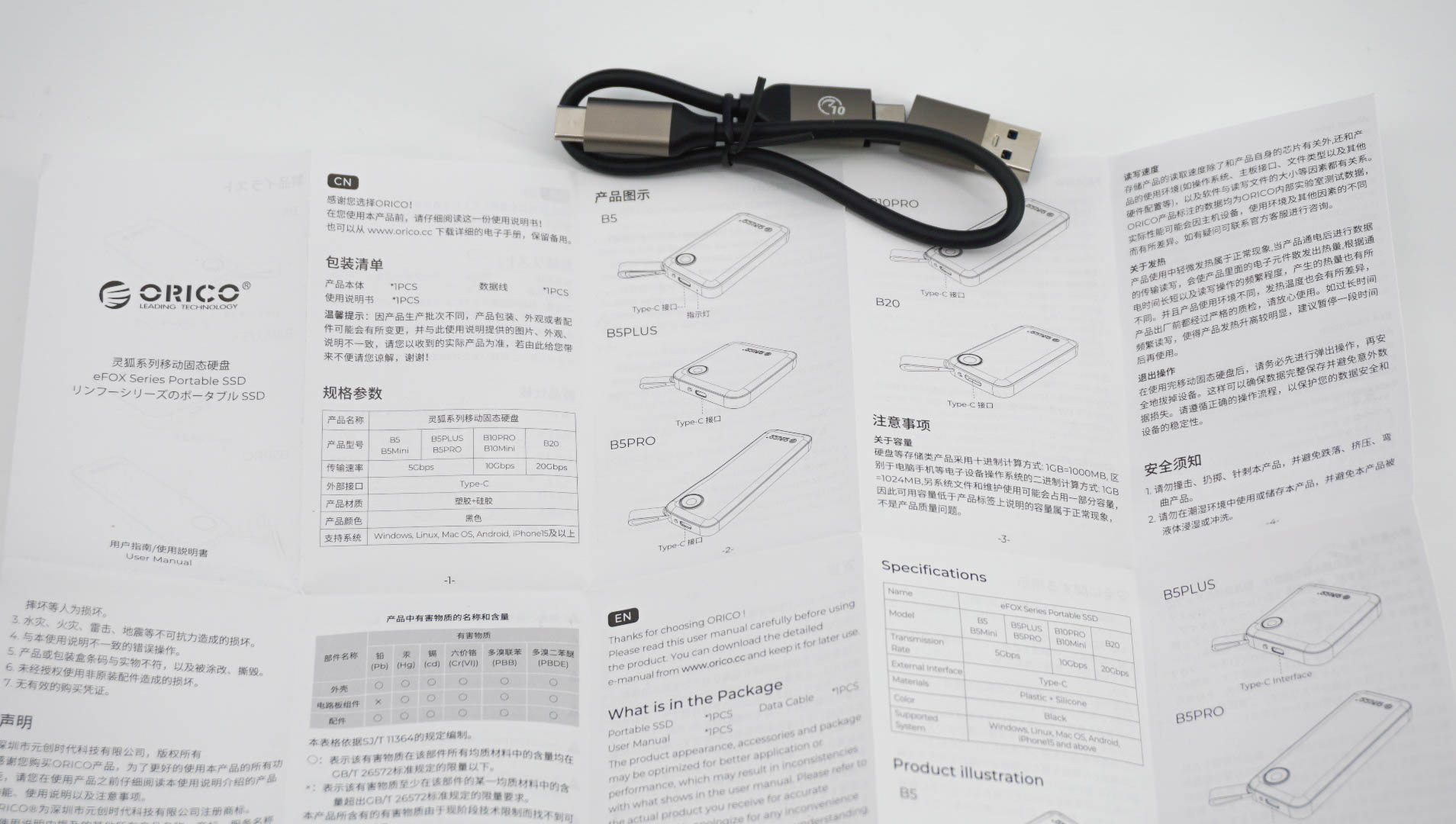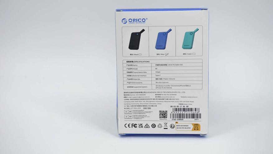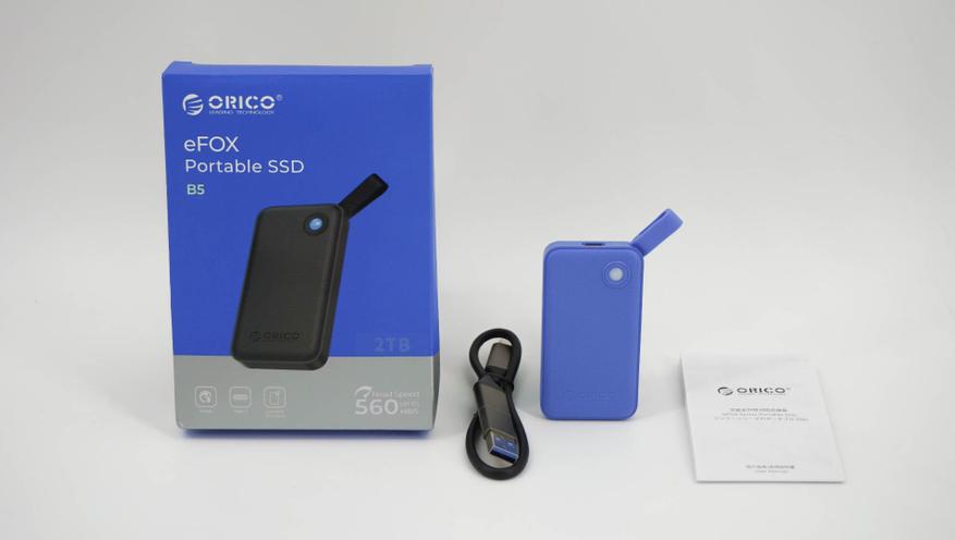 Итак, в обзоре речь пойдет про портативный PSSD ORICO из линейки B5 eFOX. На выбор есть несколько цветов и объемы памяти от 512 Гб до 2 Тб. Собственно говоря, в обзоре и пойдет речь про B5 на 2 Тб в синем корпусе. В коробке была инструкция (китайский/английский языки), а также универсальный кабель для подключения.