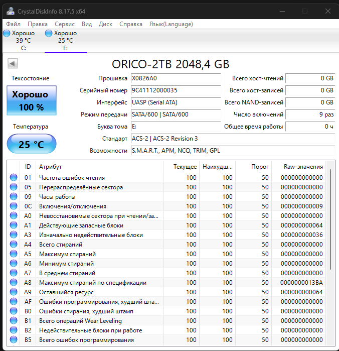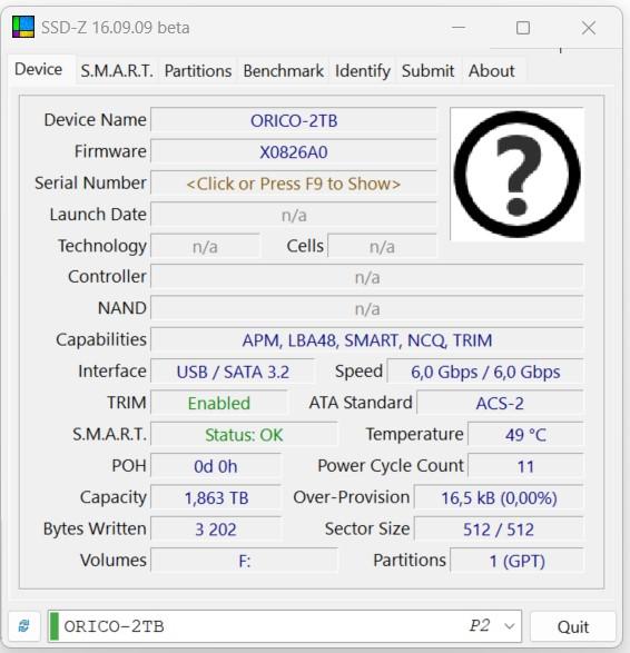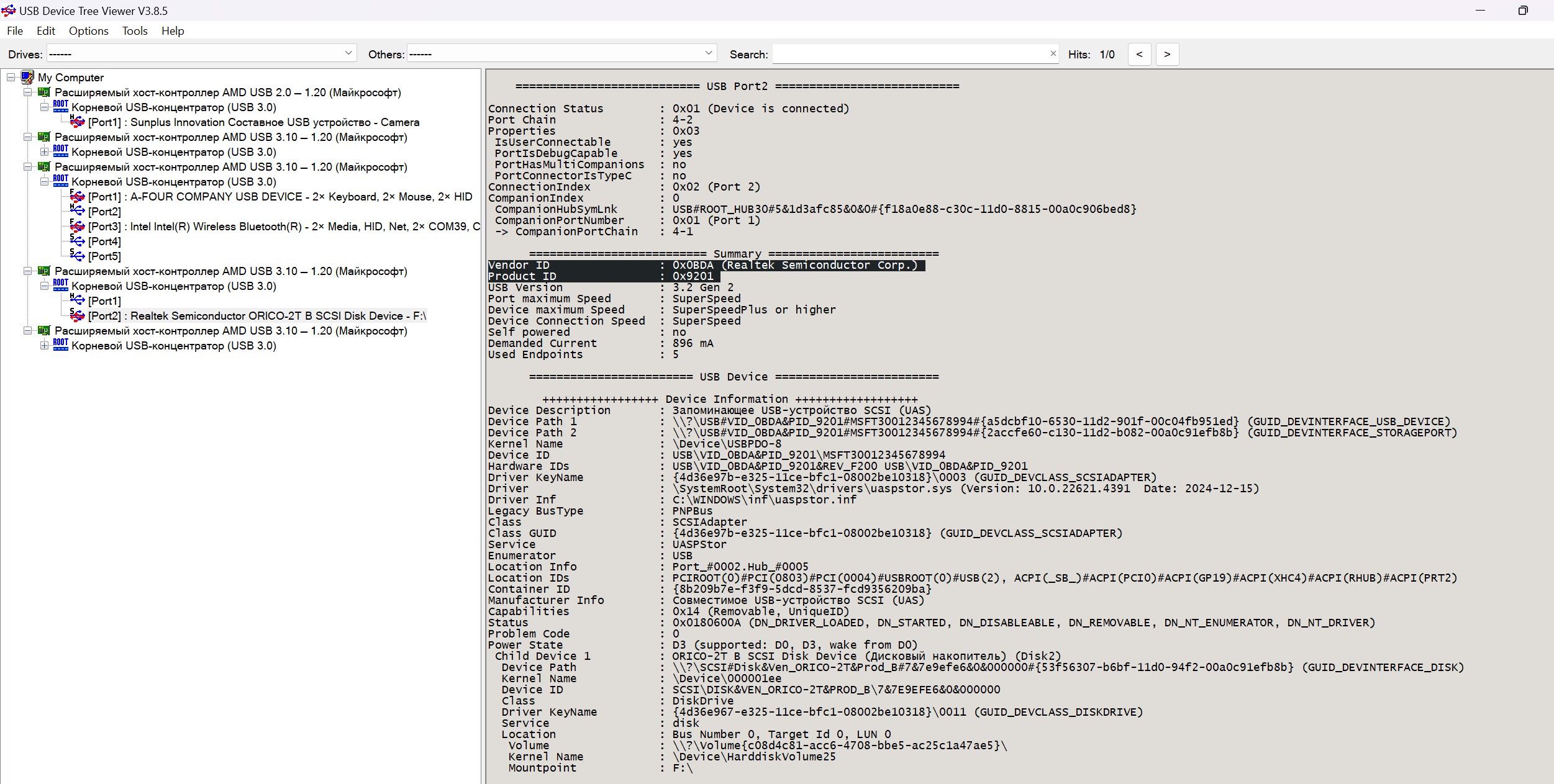 В программах CDI и SSD-Z можно уточнить параметры диска, интерфейса. USB DevTreeInfo дает информацию по вендору чипа: VID 0x0BDA, PID 0x9201 (контроллер интерфейса Realtek RTL9210 NVMe to USB).