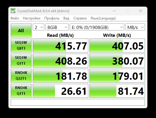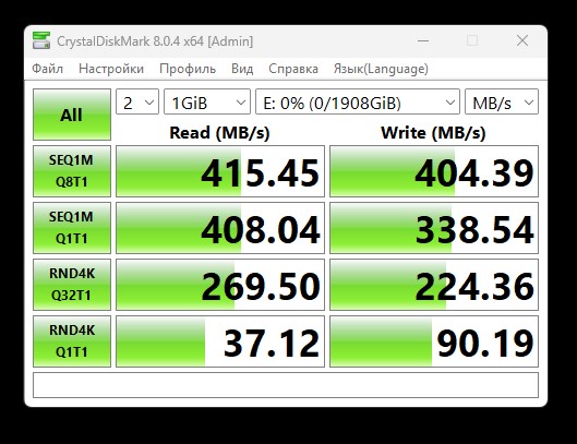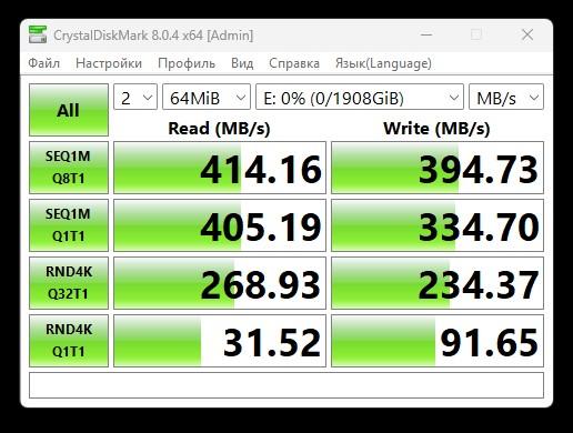 Измеренные параметры доступа в программе CDM составили от 394 до 404 МБ/с на последовательную запись блоков и примерно 414…415 МБ/с на последовательное чтение блоков. Использовался как интерфейс USB 3.2 Gen2, так и USB4, отличий в результатах практически нет.
