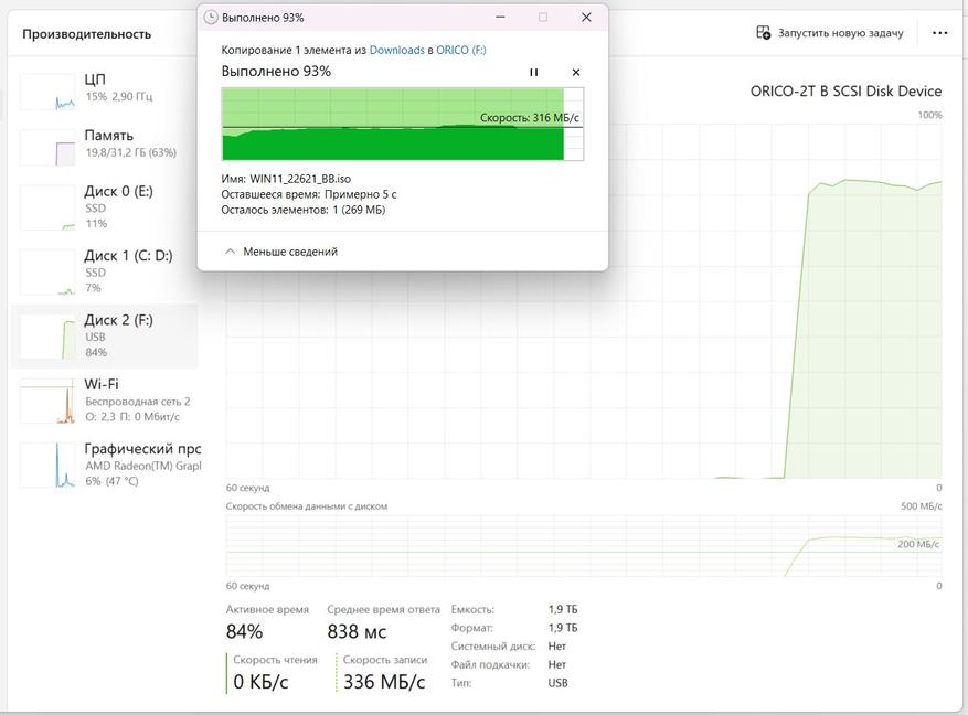Обратно на внутренний SSD копирует чуть быстрее. Скорости записи и чтения более чем приемлемые для моих целей.