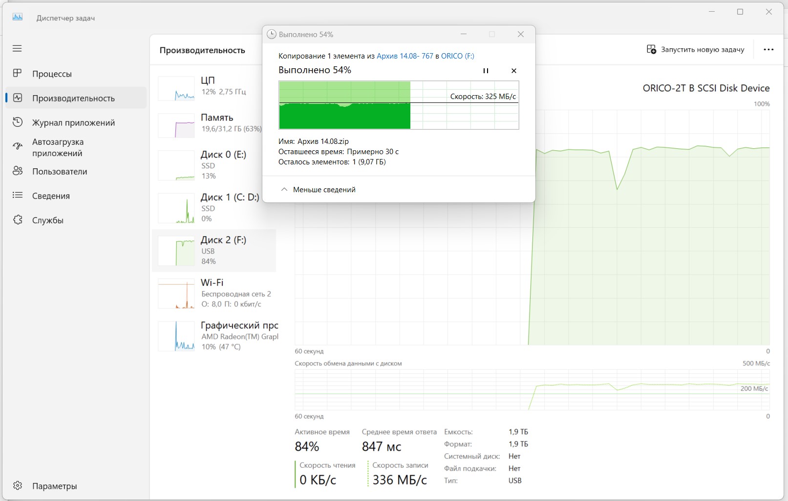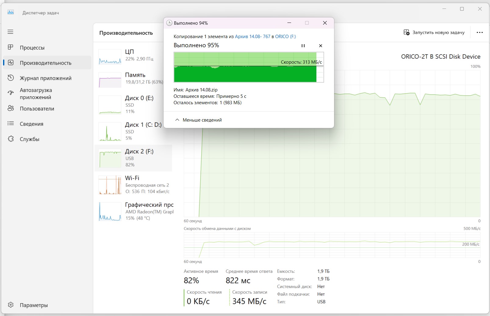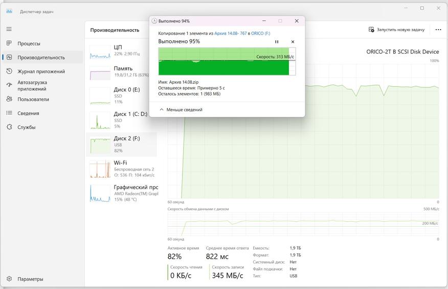 - копирование архива на 20 Гб за время около 50 секунд, без разрывов и падений скорости;