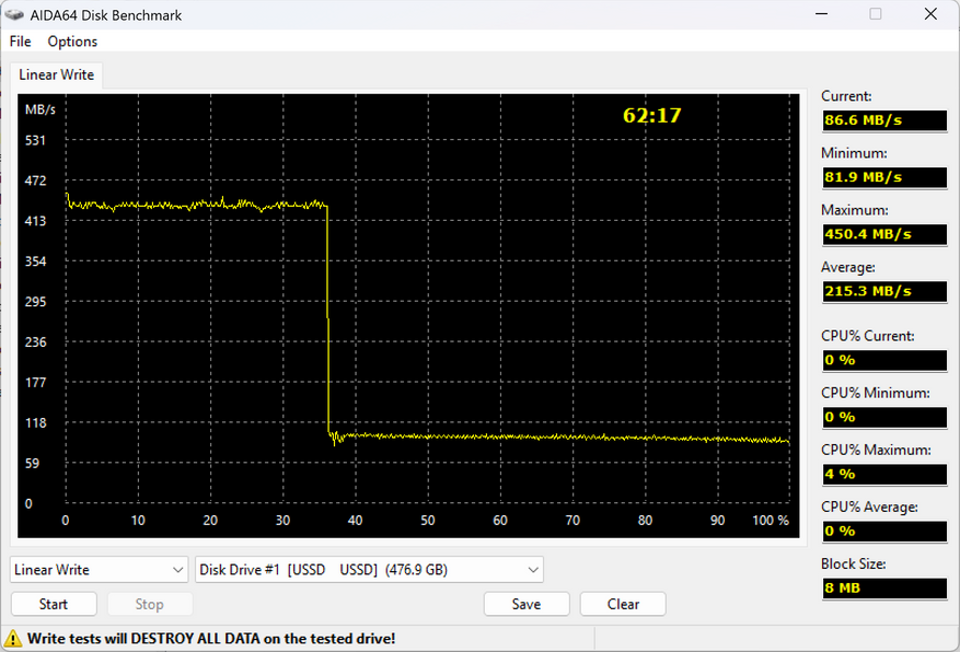 Переходим к ней. Типичный для SM2259XT2 график полной прописи: всё свободное место — под кэш, в кэш под 450 МБ/с, как кончился — нужно старые данные разгребать и новые принимать, так что 80-90 МБ/с. Мало, конечно — но была б QLC, так и вовсе было бы 40-50 МБ/с. Зато кэш, хотя бы, большой — так что если не записывать больше трети свободного места, всё быстро и хорошо.