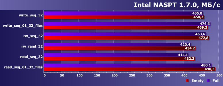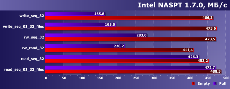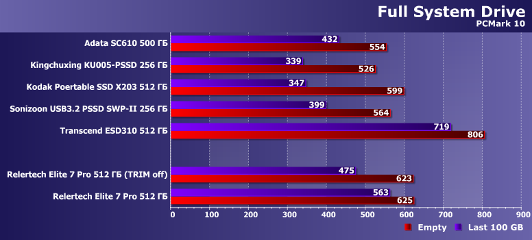 Напомню, что тест записывает порядка 200 ГБ данных, так что «заготовленного» кэша тут заранее не хватит. И пауз мало, чтобы заниматься самообслуживанием. Но файлы не только пишутся, но и стираются, а в этом случае очистить блоки можно и успеть. Поэтому и такая заметная разница между работающим и неработающим TRIM. На пустом устройстве и то пару баллов выжали, хотя здесь при 512 ГБ ёмкости кэша почти хватило. А самый заметный прирост — на непустом.