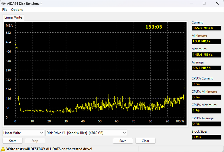 За пару минут делаем это самое «лучше». И наслаждаемся :) На самом деле, конечно, кэширование — не панацея: как только решено будет записать файл, размерами больше трети свободного места, тормоза вернутся. Но треть писать можно быстро. А это и по нынешним временам не так уж и плохо. Поскольку на деле и самые «правильные» флэшки тоже часто завязаны на кэширование, так что и у них та же проблема. Пусть и в меньшей степени — поскольку заметно ниже 100 МБ/с скорость вообще не падает. Однако гигабайт в секунду по всему объёму в компактном исполнении ныне пока не умеет никто. Да и в таком виде оно само по себе сложно — тепло девать некуда будет, так что скорость упадёт уже от тротлинга. А вот это — более-менее разумный компромисс. Бюджетный компромисс, во всяком случае.