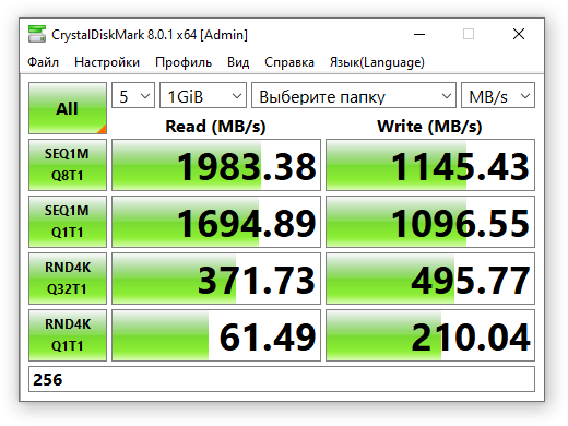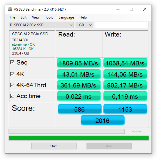 Результаты теста AS SSD, несмотря на наличие HMB, ниже, чем у большинства накопителей с DRAM буфером. Придется выбирать между стоимостью или скоростью при записи большого количества файлов.